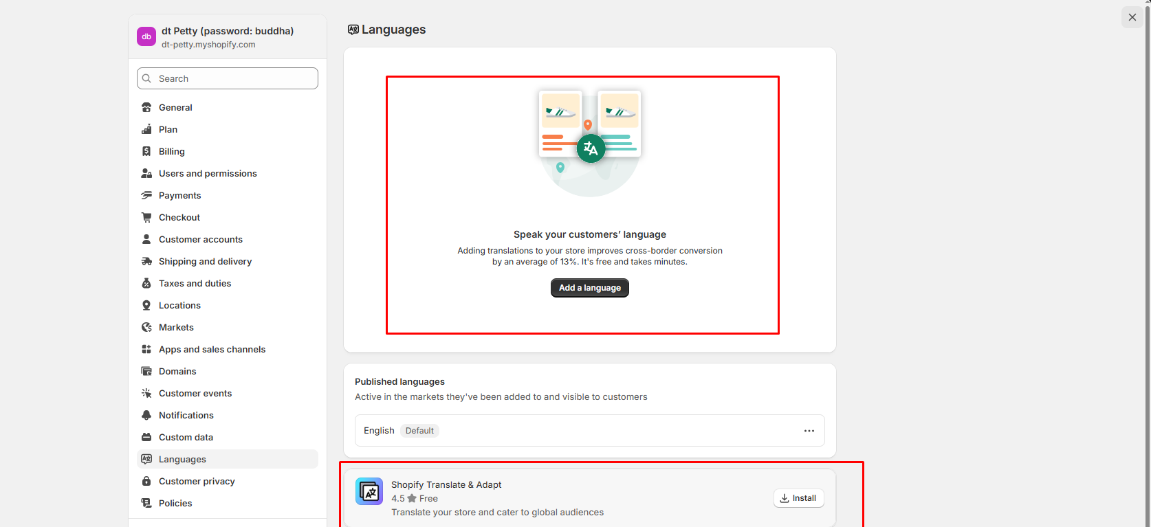 Open Admin Store Settings > Languages > Install translate & adapt app ( Shopify Translate & Adapt).