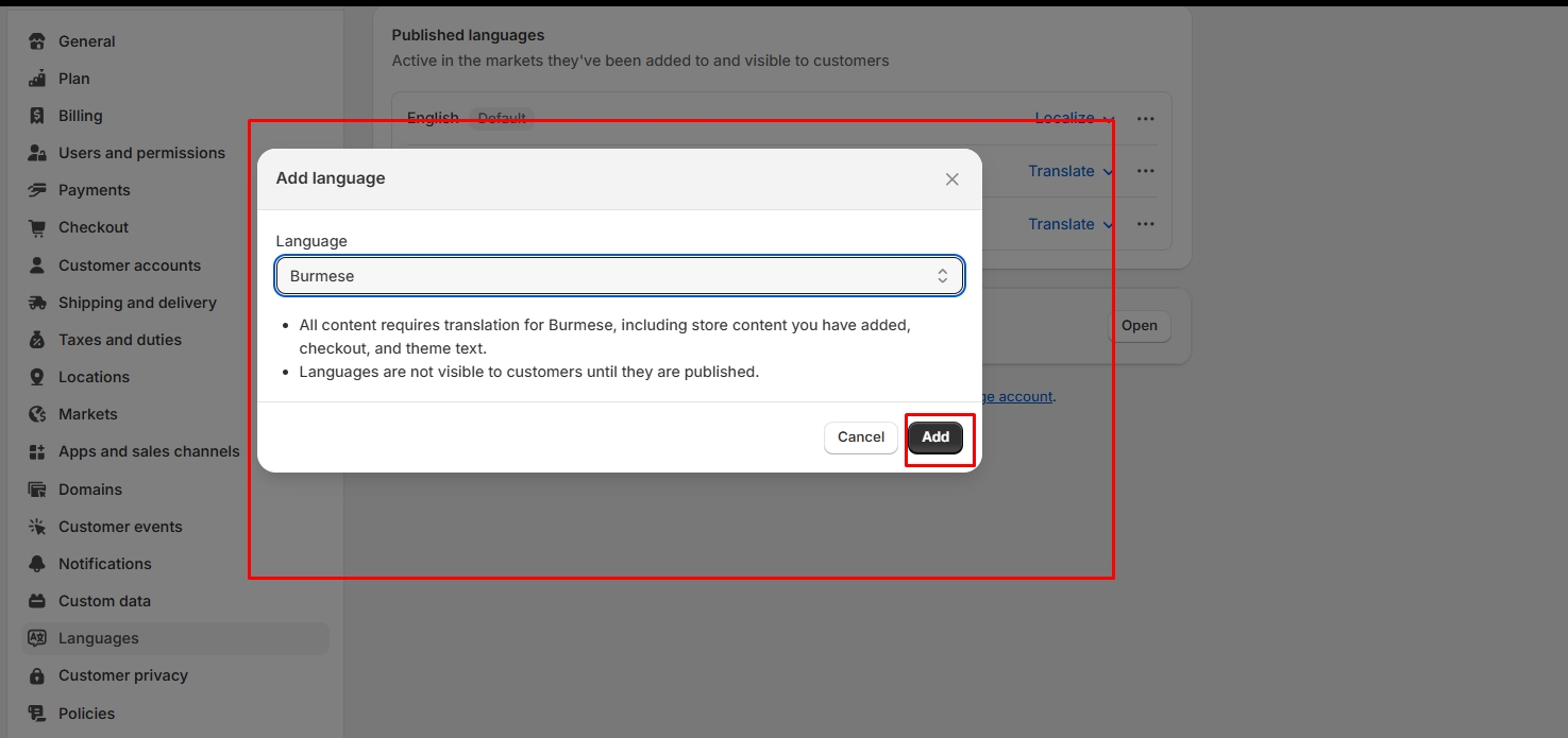 Open Admin Store Settings > Languages > Install translate & adapt app ( Shopify Translate & Adapt).