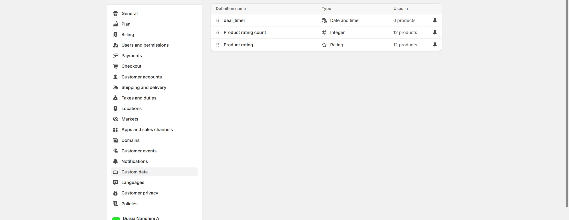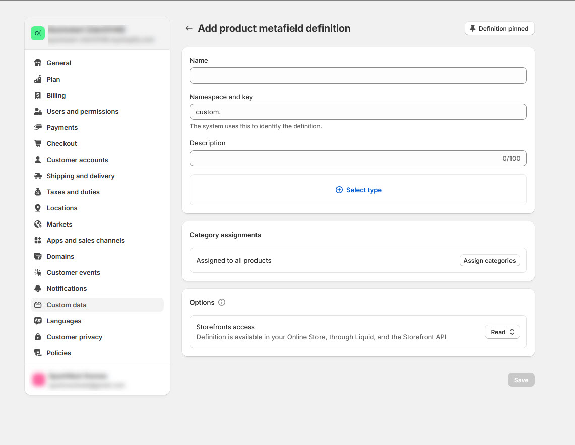 Select Settings > Custom data > select any metafield Eg:(Products) > Add definitions