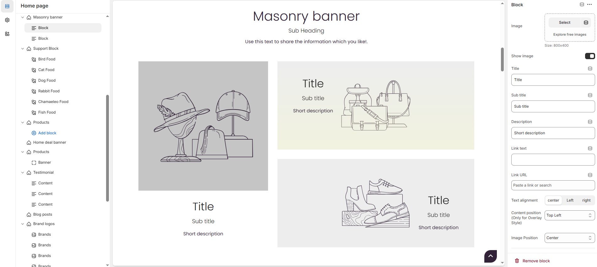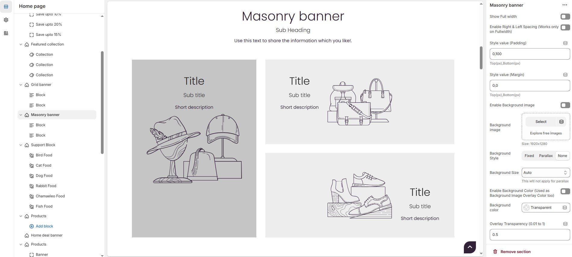 The Masonry Banner section allows you to display multiple banners in a structured grid layout, enhancing the visual appeal of your store. This section is ideal for showcasing promotions, featured collections, or seasonal campaigns.