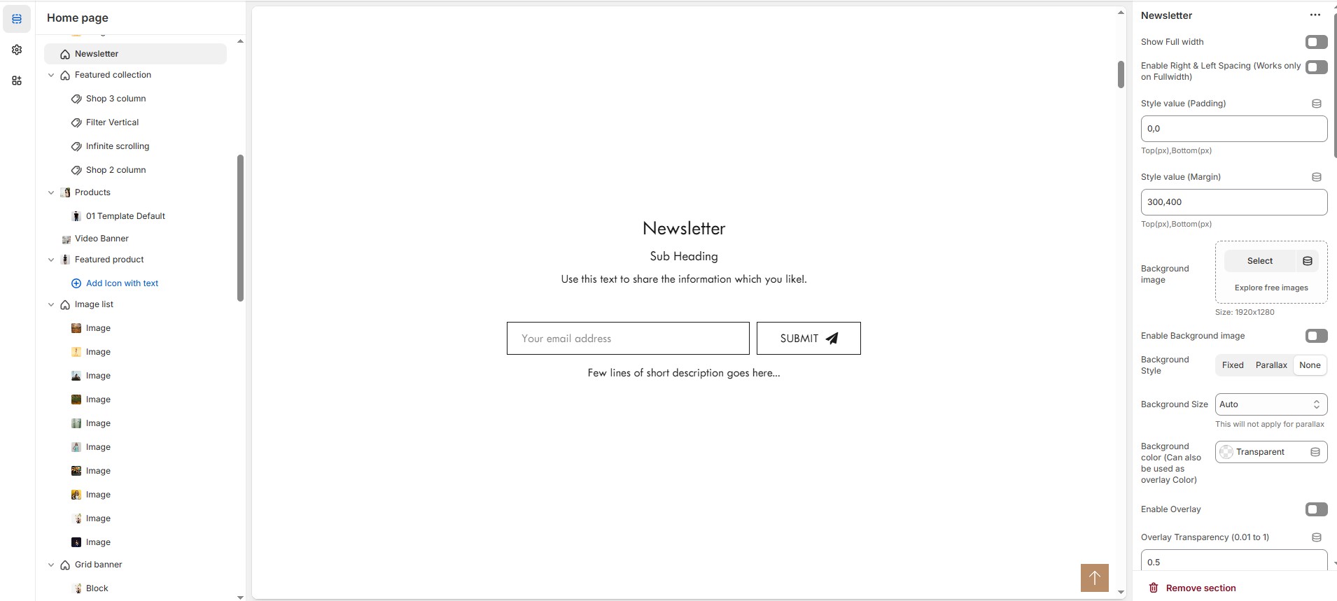 The Newsletter section allows you to collect customer email addresses for updates, promotions, and exclusive content. You can customize the section’s layout, colors, and styles to match your store’s theme.