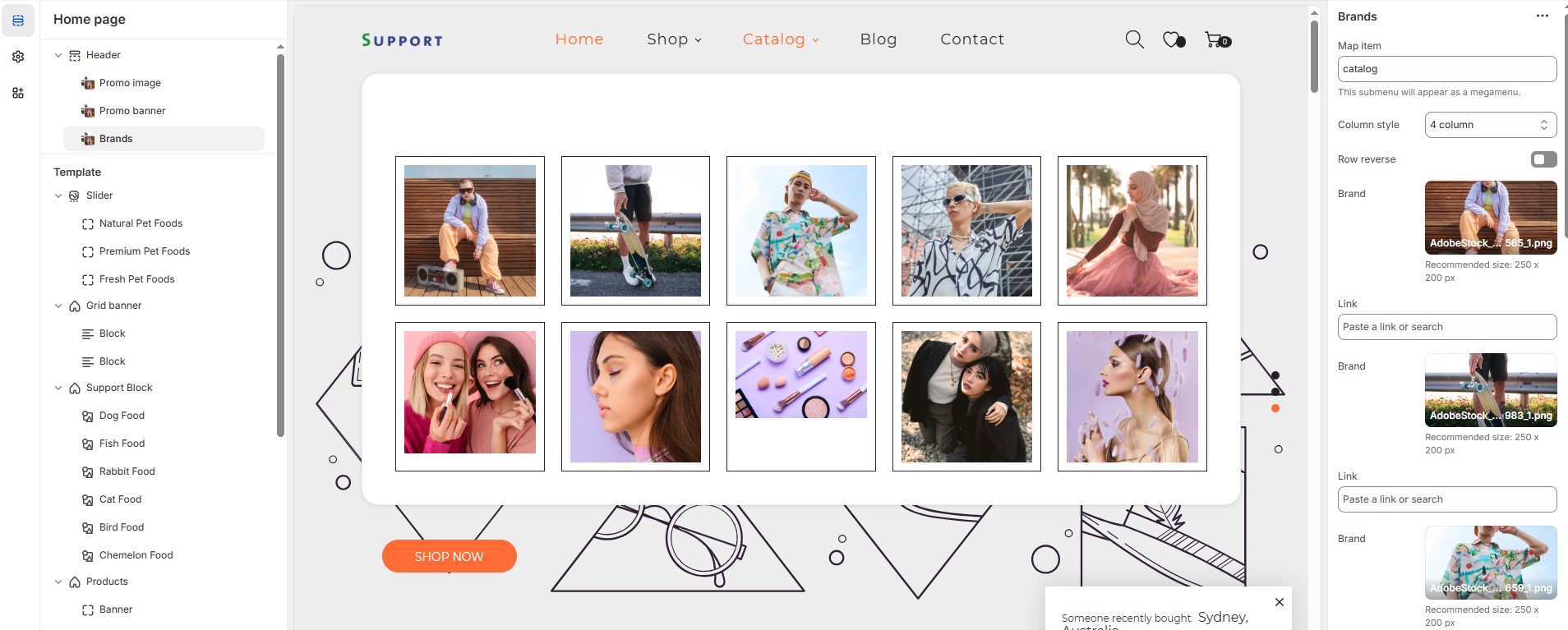 The Brands Section in the header allows you to showcase multiple brand logos within a megamenu, improving brand visibility and enhancing navigation.