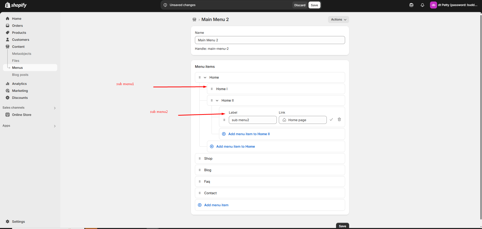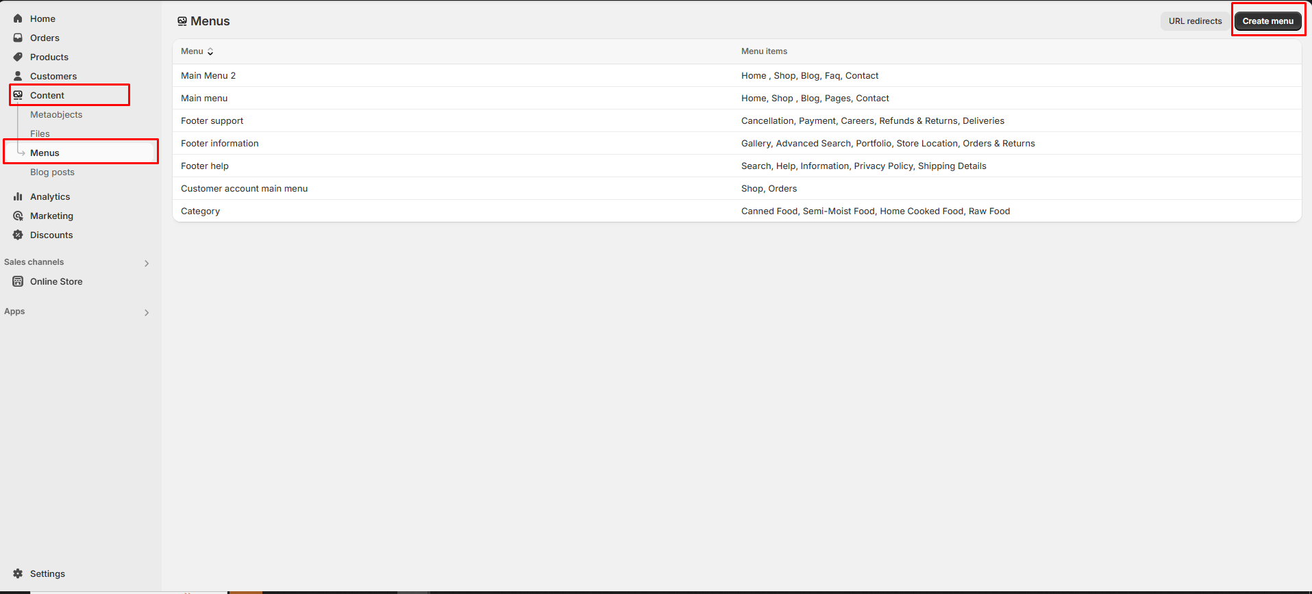 * Go to **Online Store > Content > Menu in your Shopify Admin.**