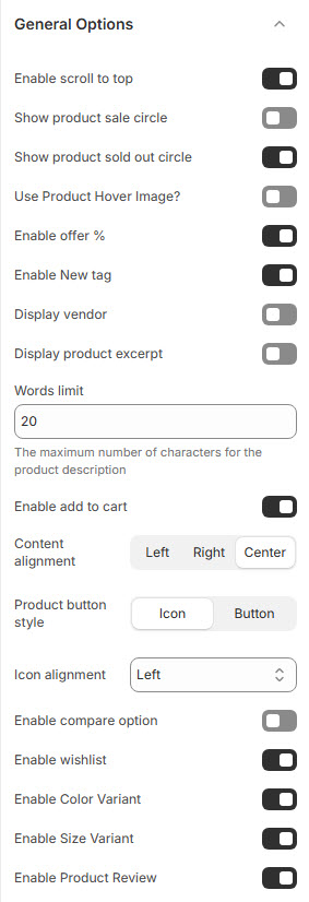 The **General Options** settings allow users to configure essential display features for products, improving the shopping experience with enhanced visual elements and functionalities.