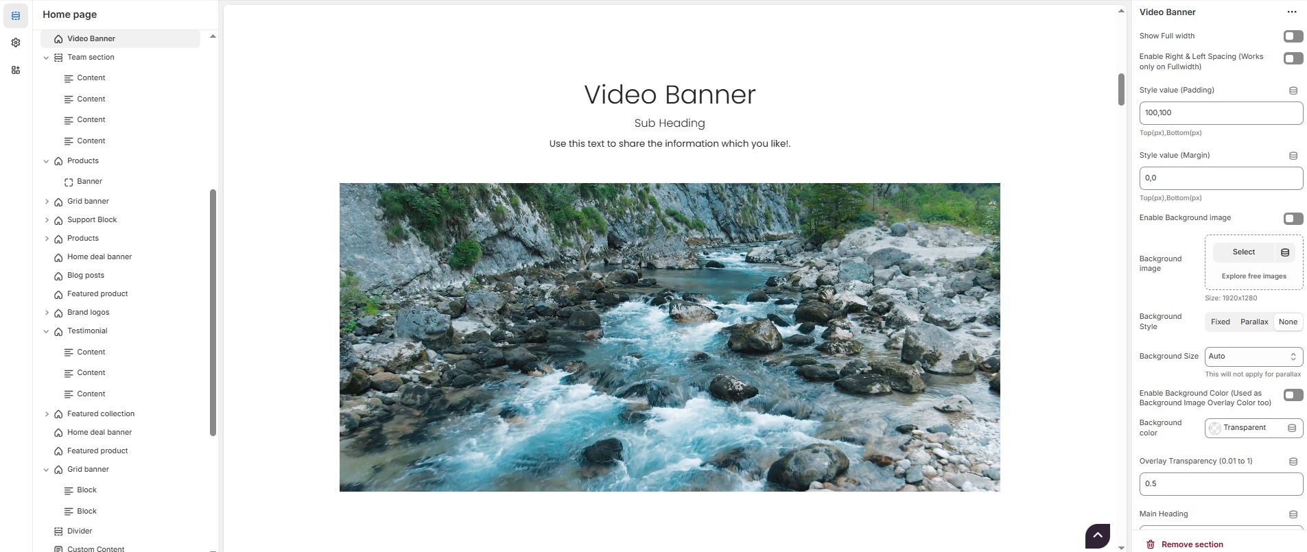 The Video Banner section in Shopify allows you to add an engaging video background or popup video to enhance your store’s visual appeal. This feature is great for promotional content, brand storytelling, or product showcases.