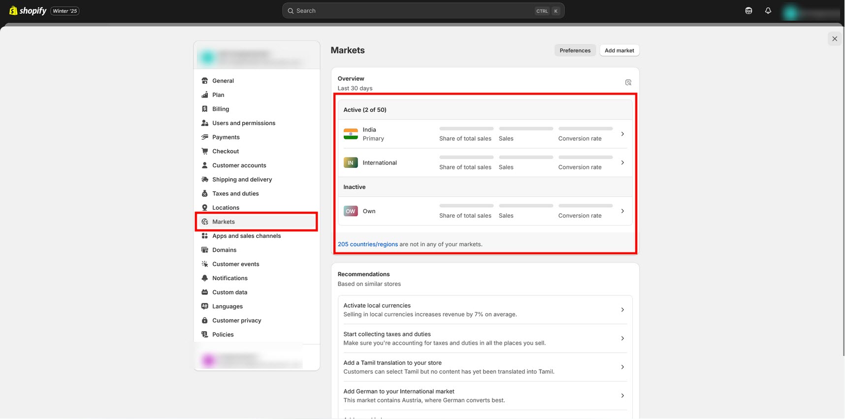 Set up your store’s Markets under Online Store > Settings This defines the regions that you sell to (you would have had to do this already to set up international shipping rates).